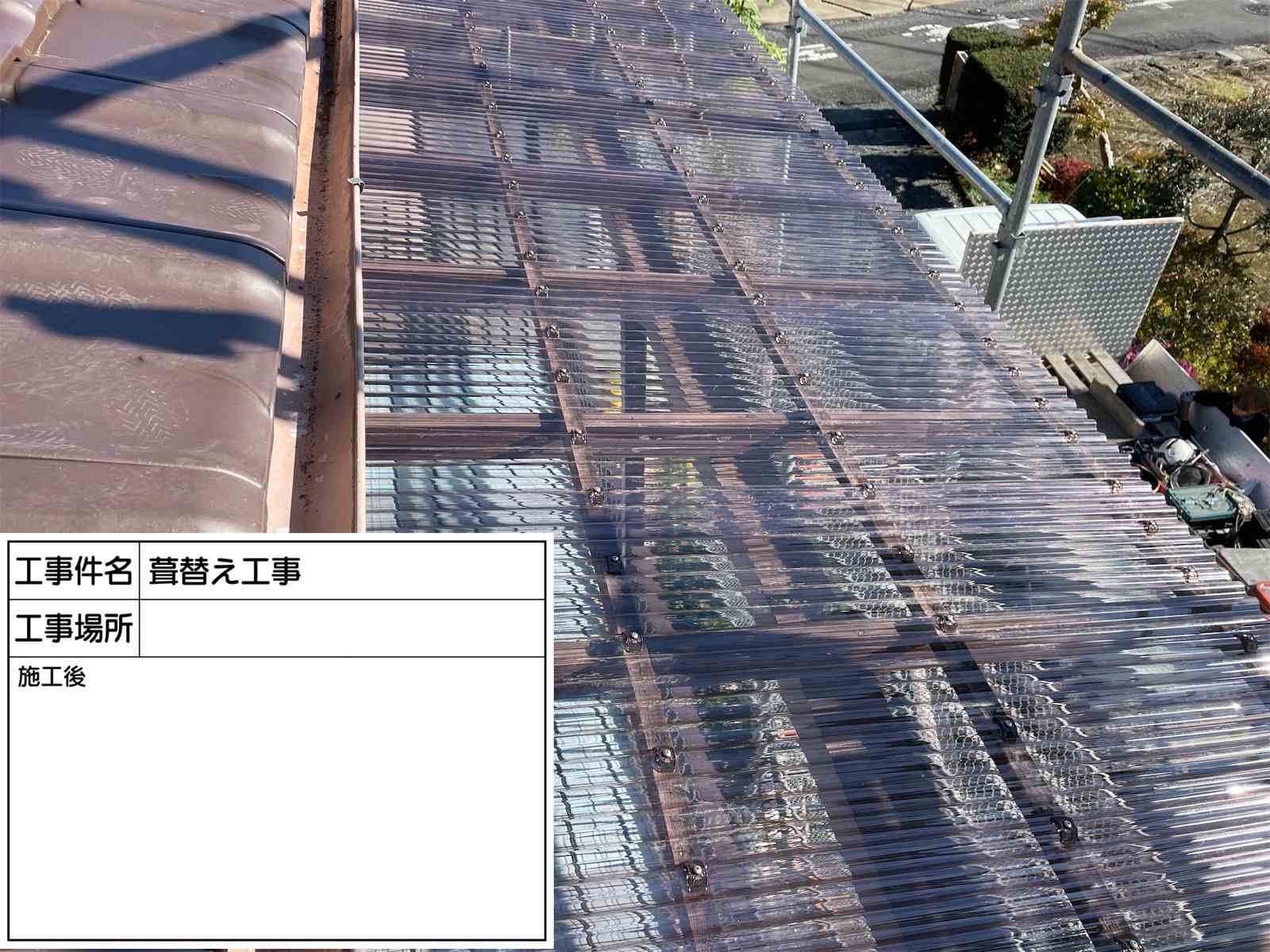 | 波板交換+周辺補修 | 状況により異なる|2日~ | 屋根塗装や漆喰も気になる |