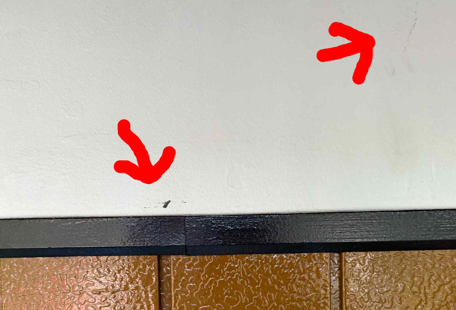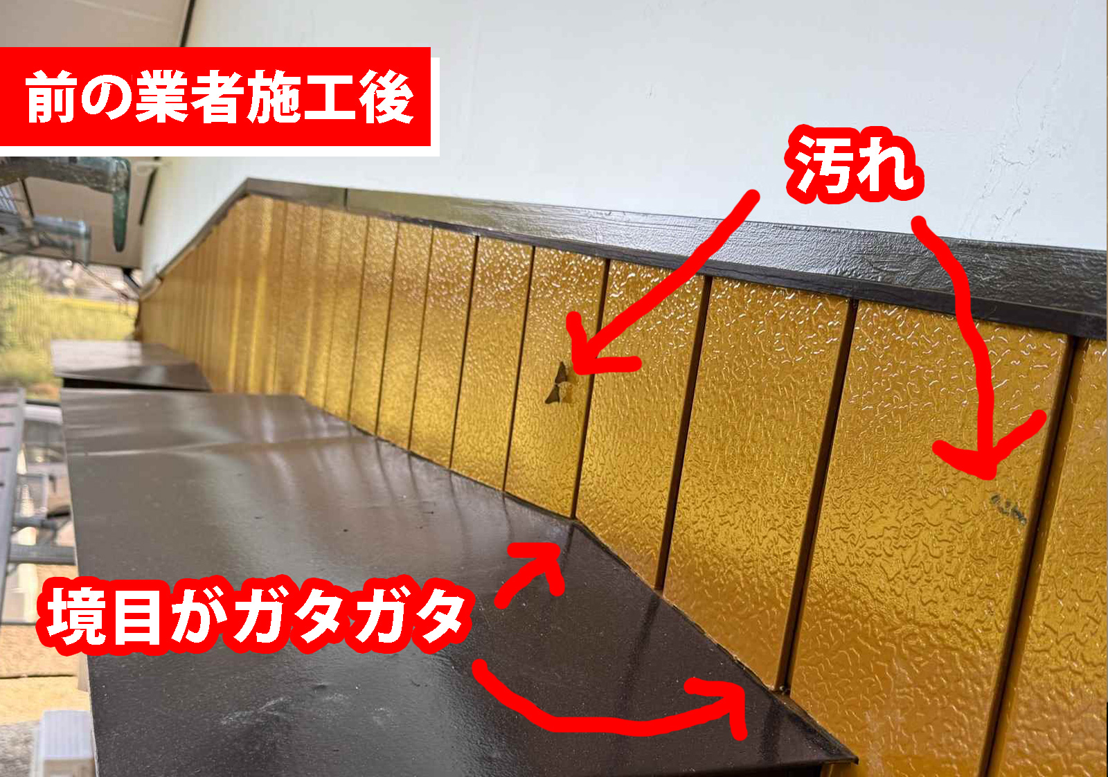 遠目では一見きれいに見えるものの、近くで確認すると外壁と下屋根の境目 や 外壁の塗料汚れ といった塗装箇所が目立ちます。